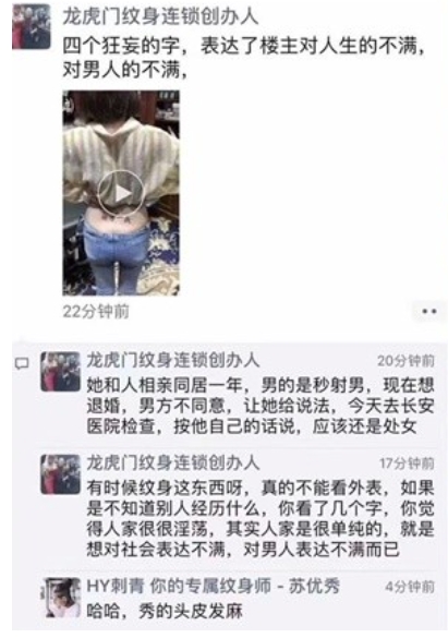 少女透露,透過相親認識一名男友,同居一年後,發現對方那方面表現不佳,幾秒鐘就完事,還不肯退婚,去長安醫院檢查後,驚覺「自己還是處」,種種一切都令她萬般無奈,決定在腰間刺上「用力×我」。