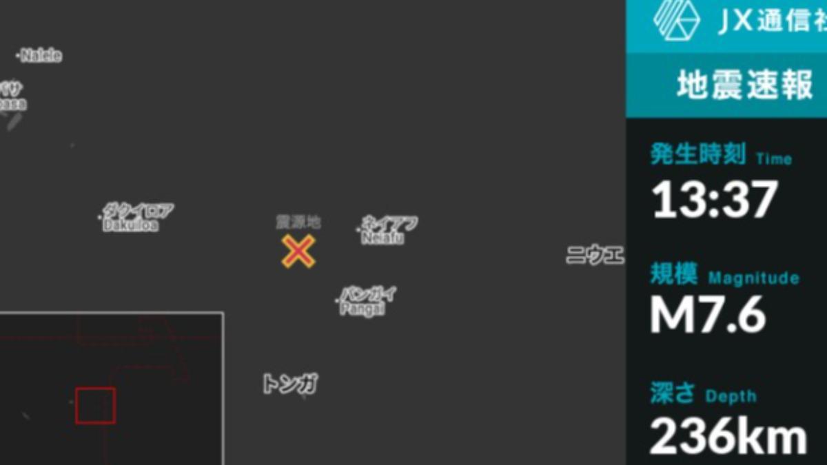 太平洋地區地質活動頻繁,島國東加於台灣時間今日(24日)中午12時37分傳出規模7.6強烈地震,震源深度達236.7公里。根據《TVBS新聞網》報導,美國地質調查局(USGS)及日本媒體《News Digest》皆證實此次強震消息,震央位置在東加城鎮內亞富(Neiafu)往西南方向約112公里的海域,所幸目前並未接獲任何災損回報。