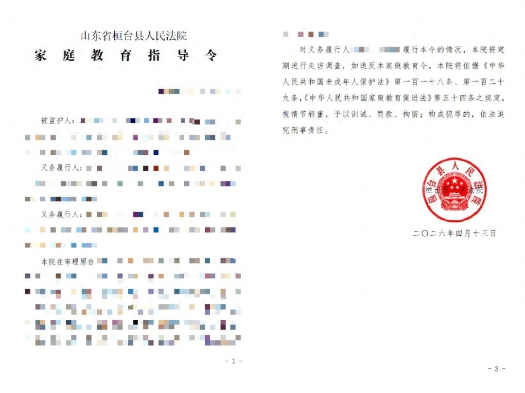 家庭是未成年人成長的第一課堂,父母是孩子的第一任老師,監護與教育責任,從來不容缺位。近日,桓台縣法院唐山法庭在審結一起未成年人無證駕駛致兩名同伴死亡的生命權、身體權、健康權糾紛案件時,針對案件暴露的家庭教育缺失、監護責任缺位等突出問題,依法發出2026年首份家庭教育指導令,以剛性司法力量介入家庭教育,督促監護人扛起監護職責,為未成年人健康成長築起法治屏障。
