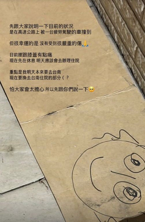 根據《ETtoday星光雲》、《三立娛樂星聞》報導,章魚透過社群平台限時動態向粉絲說明,當時她正行駛在國道上,突然被一輛疑似疲勞駕駛的車從後方撞上。事故發生後,她立刻到醫院接受檢查評估傷勢狀況。