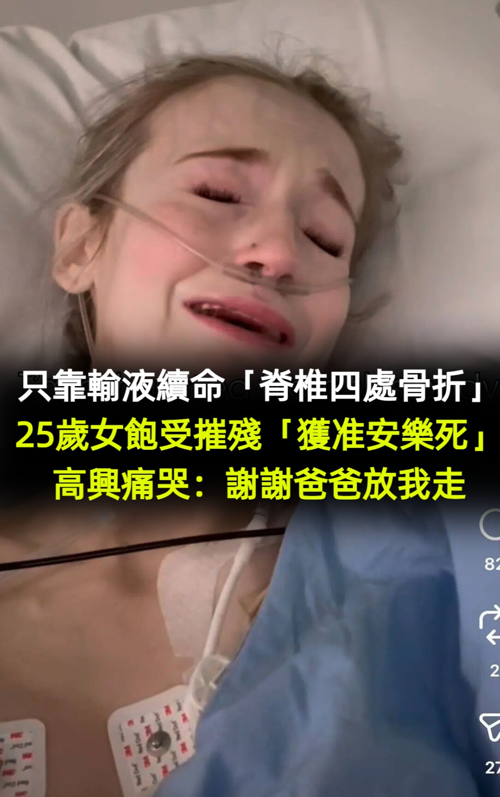 只靠輸液續命「脊椎四處骨折」!25歲女飽受摧殘「獲准安樂死」高興痛哭:謝謝爸爸放我走