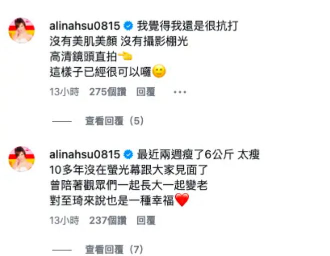 不過,徐至琦也在文末感性地寫下:「能夠陪伴著大家一起成長、一起變老,對我來說就是最大的幸福。」許多網友看完她的回應後也紛紛留言表示:「真實面對自己的樣子真的很棒!」、「敢在沒濾鏡的狀態下面對鏡頭,超有勇氣!」、「歲月本來就會在每個人身上留下痕跡,很正常啊!」、「這種生活態度值得學習,不需要在意酸民!」、「能這樣坦然面對,真的很不簡單!」