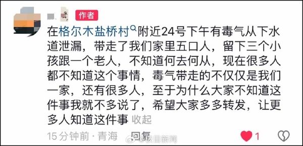 大陸青海的格爾木市鹽橋村,在晚間發生2戶人家多人死亡的慘案,分別是一戶5死、一戶1死,另有一人仍在住院治療。死者家屬小靜(化名)透露,起初是家中爺爺先吸入一股「類似蛋皮燒焦」的怪味,隨即昏迷,之後奶奶、叔嬸也都陸續陷入昏厥,最終卻只有爺爺生還,令人遺憾。