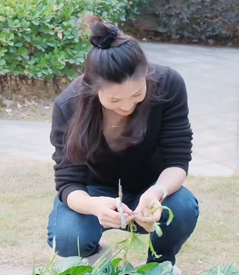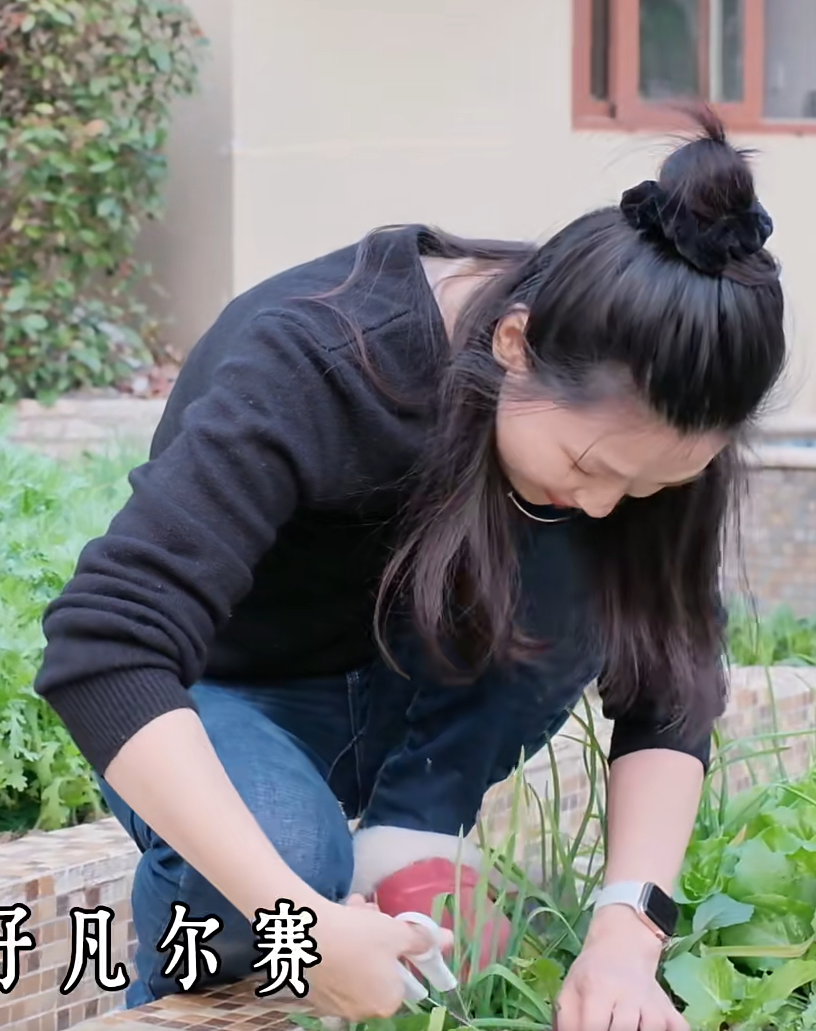於是,就有了我們現在看到的這一幕。她把別墅的泳池填了,改成了一壟一壟的菜地,自己親手種上各種應季蔬菜。從十指不沾陽春水,到熟練地鬆土、施肥、澆水;從品鑒高級甜品,到為女兒親手打桂花做蜜、煮一碗地道的寧波湯圓。她說:「一塊自留地,灑下種子,接下來交給時間。」這話是說種菜,更像是在說自己的人生。