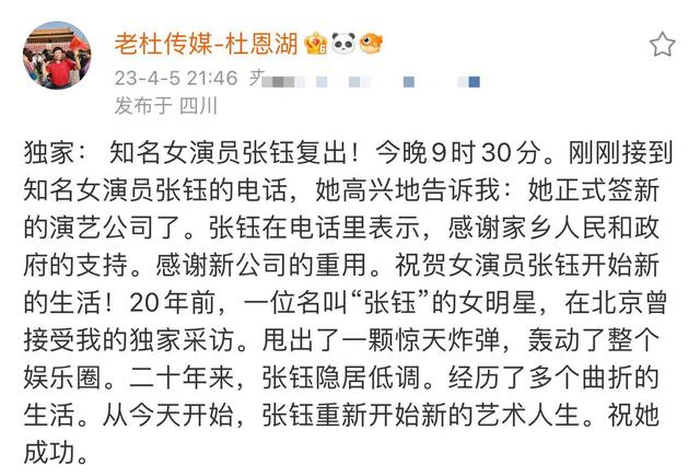 隨著事件過去20多年,就在前陣子,著名記者杜恩湖在社交帳號上發文,爆料知名女演員張鈺即將復出,頓時引發網友熱議。