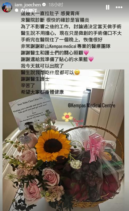 人正在馬來西亞的陳喬恩發文:這幾天一直拉肚子,感覺胃疼,來醫院診斷,很快就發現是盲腸炎,為了不影響之後的工作,討論還是決定當天進行手術,醫生說不用擔心,現在只是微創手術,傷口不大,手術之後在醫院住了一個晚上,恢復很好。