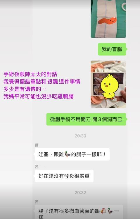 陳喬恩還貼出自己和媽媽在手術之後的聊天對話,媽媽還笑著調侃她手術切下來的病理部位像雞鴨的腸子。