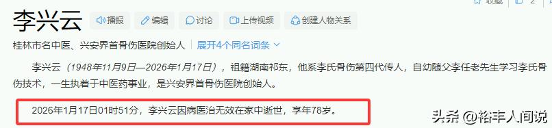 多位來自廣西桂林界首的網友透露悲痛消息,當地知名醫生,曾獲得「八桂明珠」之稱的李興雲不幸因病去世,享壽78歲。