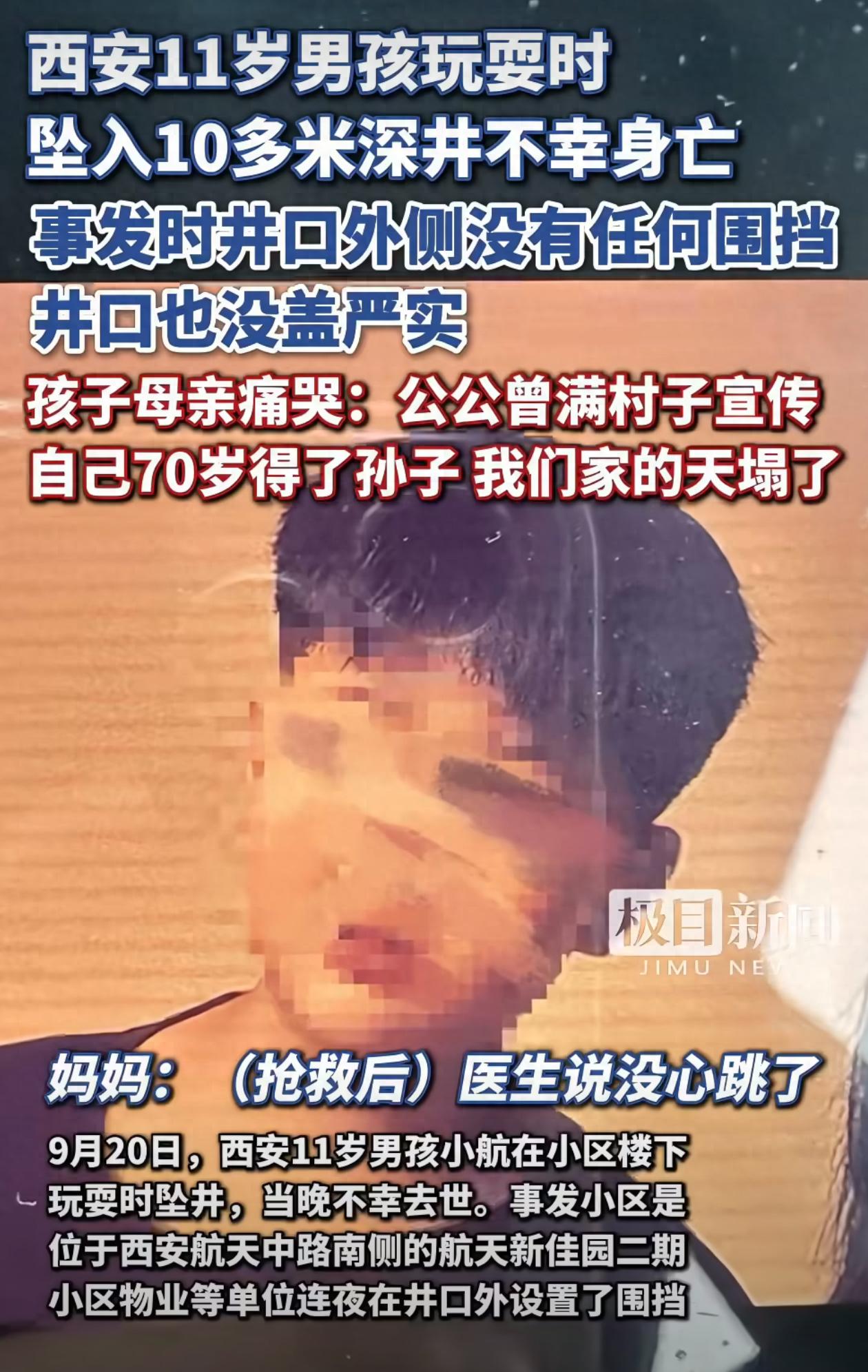 9月20日,西安11歲男孩小航在小區樓下玩耍時墜井,當晚不幸去世。9月21日,知情人及小航家屬對極目新聞記者稱,這個井深十幾米,垂直通向地庫。事發后,小區物業等單位連夜在井口外設置了圍擋,而小航墜井時,此處沒有圍擋,地面簡易的木板和泡沫墩子沒有把井口蓋嚴實。目前,警方、住建、應急等單位已介入調查。