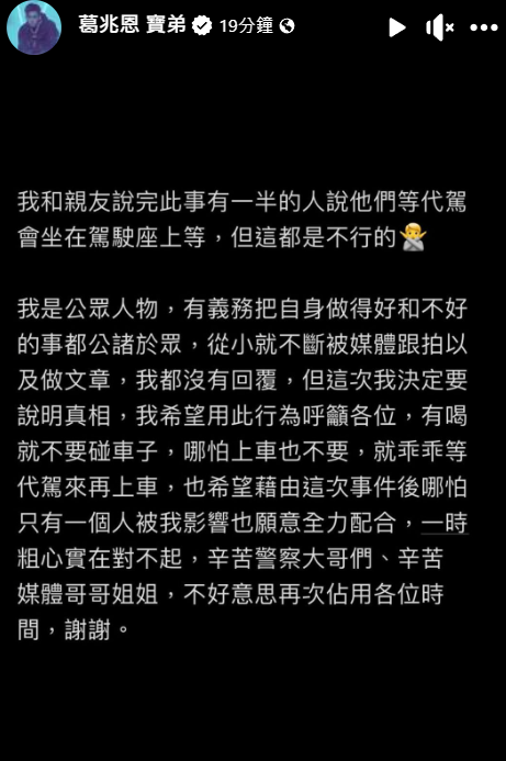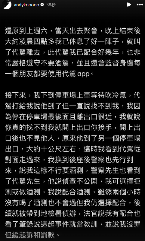 他發聲明指出,法官認為他全程都配合,加上這起事件的筆錄顯示,應該是沒罪,但是就當作教訓,緩起訴跟罰款。他表示問過周遭很多人,等代駕的時候都會待在駕駛座上,但其實這樣是不可以的,身為公眾人物也應該以身作則,因此一時粗心覺得相當抱歉,感謝大家的關心。媽媽金友莊則回應:「我們常互相提醒,往後還是要繼續嚴格監督,等代駕歸等代駕,酒駕歸酒駕。我們老百姓要隨時更新法條。」更強調兒子如果有酒駕,應該不會現在才知道。