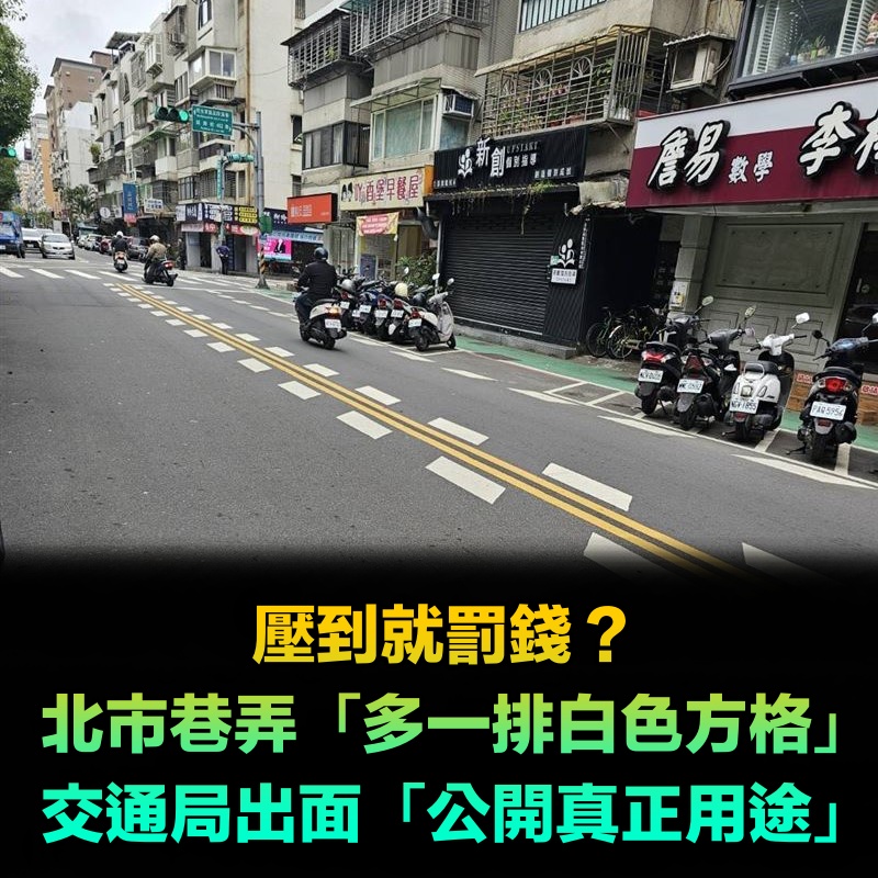 壓到就罰錢?北市巷弄「多一排白色方格」超密集 交通局出面「公開真正用途」 力量人 2026-01-23 檢舉 交通局進一步說明,這類「視覺化減速標線」通常設置在事故發生率較高的地點、彎道處、巷弄狹窄路段,或是行人往來頻繁的區域。目前除了台北市外,其他縣市也逐步在特定路段導入這項措施。雖然此標線不具處罰功能,但交通局也提醒,若駕駛人看見此標線仍以高速行駛,一旦發生事故,仍可能因未留意路況、未適當減速而被判定負有肇事責任。圖片來源:彰化縣政府教育處 臉書好神奇喔~有人有看過這種標線嗎!資料來源:TEEPR亮新聞 Advertisements 回首頁 2/2 Advertisements 編輯精選推薦 More + 他真的每天都在...具俊曄「暴瘦坐墓園」天天伴亡妻 粉絲直擊「悲傷身影」淚:最深情男人 離婚11年!洪榮宏愛女結婚「終破冰前妻」 「2爸爸牽她進場」催淚畫面曝 空窗多年!68歲陳美鳳突羞認「身邊有個他」 40年前就認識「遭男方母親拆散」 22歲愛女病逝!資深男星「走不出喪女痛」留白長髮現身 掛骨灰項鍊「代女做1事」惹淚 狠斷8年婚!一線小生「被爆淨身出戶」終於離婚 認了「像被雷劈到」才會娶她 本土劇女星生了!7年前凍卵「終於來到我身邊」 歌手尪嗨喊:生個足球隊 85歲失智父身亡!林葉亭突宣布「皈依佛門」 遇大師「開示一番話」忍不住淚崩 趕在40歲前閃婚!八點檔女星「宣布嫁給他」 尪驚人身分曝「媒人是柯叔元」 台中要加發每人5萬元?盧秀燕最新回應:「1條件」就發錢 婚變尪落跑!單親媽「獨扛千萬債養孩」到處躲黑道 「一開口驚艷眾人」熬成台灣歌后 中國增加關稅!台灣1水果「出口雪崩下跌」重創農民 政府急了:國人快買 格林童話小鎮❤️濱海城鎮裡「繽紛繪本小木屋」林立街道旁 為維護童話氛圍「霸氣禁止連鎖店進駐」 曾比江蕙紅!台語歌后「爆未婚生子」遭指指點點 「2次手術害癱瘓」72歲近況曝 晚年隱居台東!68歲名主持失蹤「車內身亡」 伴侶悲曝「死前做1事」:還掛念著我 以為只是小感冒!本土女星悲痛證實「他併發肺炎過世」 一度淚灑現場「後悔同意插管」 弟成植物人、姊猝逝!玉女歌手「遭前夫設套」騙走娘家房產 「狠斬16年婚姻」近況曝 功德圓滿了!台語歌后「悲曝他離世」享壽95歲 淚喊:去當快樂的神仙吧... 24歲兒失明!于美人爆「他在飯店掃廁所」維生 不盼紅包只求「別再花我的錢」 壽司店狂嗑1小時!2位大媽「結帳竟然是0元」黑暗手法曝光 店員傻眼:「直接走出去就好」 台灣大咖病逝「享壽83歲」!周遊告別式痛哭「認婚內出軌」:兒子很恨我... 40萬塊全搞定!二手老屋「一下雨就漏水」根本無法住 暴風改造「北歐風質感豪宅」浴室根本網美點 精神不好、恢復力差都因為它!老人「缺乏蛋白質」很致命 5大「最佳高蛋白食物」曝光:雞蛋墊底 15歲兒「睡夢中離世」!本土女星「送愛子火化」求做1事 「PO照圓滿了」:媽媽和你永不分開 最新/3度中風送醫!資深男星爆離婚「斷50年髮妻」 「砸1億淨身出戶」家族爆紛爭 最新/賈靜雯深夜慟曝「她已離世」 淚PO合照喊:真的好愛你...
