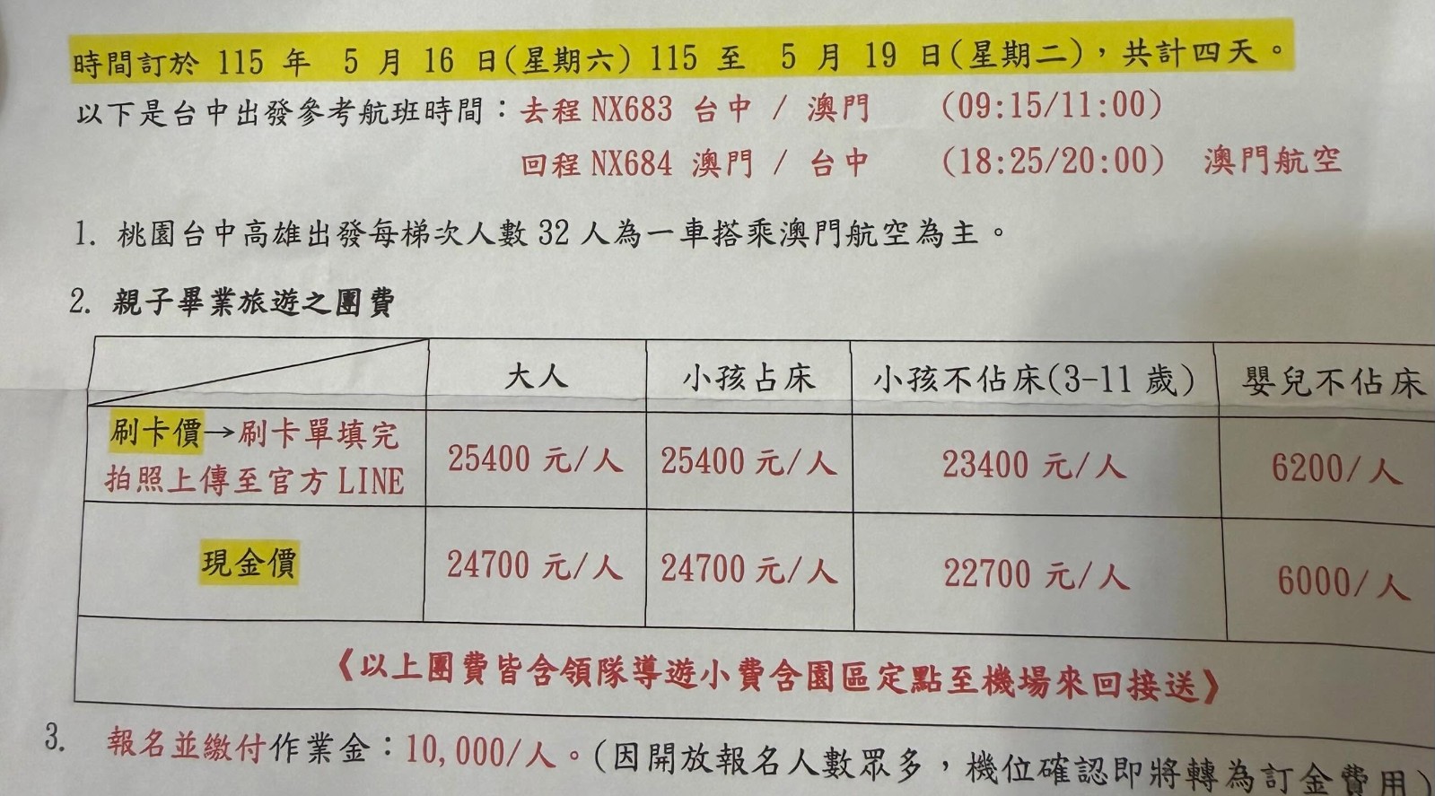 根據《ETtoday新聞雲》報導,這趟親子畢業旅行預定於明年5月16日至19日出發,前往澳門展開4天3夜行程。收費標準方面,無論大人或小孩若需要佔床,每人費用為2萬5400元;3至11歲孩童選擇不佔床則為2萬3400元;若攜帶嬰兒同行也需支付6200元。這筆費用已涵蓋領隊與導遊小費,以及園區到機場的雙向接駁服務。