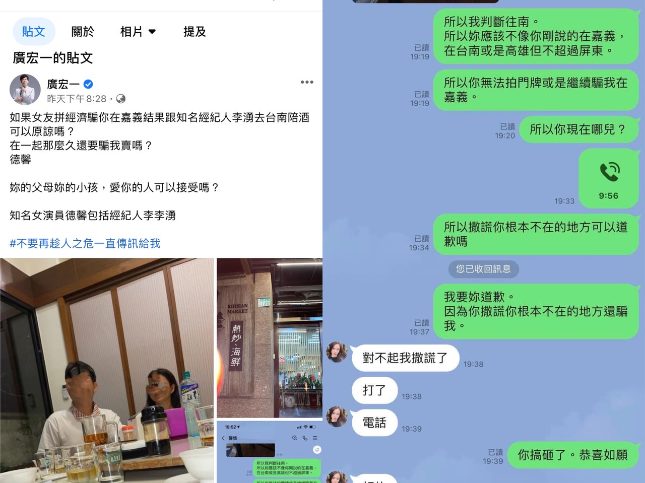 只見聊天紀錄中,廣宏一先是質疑德馨人根本不在她所說的嘉義,隨後雖然有通話聯絡,但紛爭還是沒有解決,讓廣宏一氣得請她為說謊一事道歉,而德馨也承認:「對不起我撒謊了」,廣宏一隨後心寒表示:「你搞砸了,恭喜如願」,同時也附上兩張餐廳照片。貼文曝光後許多網友們都在留言區緩頰,建議兩人先理性的好好溝通,不過廣宏一還是無法冷靜,可見對於女友說謊一事非常震驚和受傷。