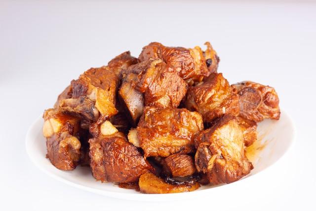 飯桌上的紅燒排骨,我做的不錯,老公知道我愛吃,就夾了一塊給我。