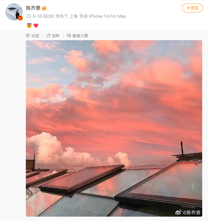 而陳喬恩亦是如此,她對於喬任梁的離去久久無法忘懷,只要到了每年的9月16日,她都會在社群上發文悼念故人。她常常在當天PO出天空照,先前喬任梁過世7年,她在微博上傳一張粉色天空景色照,雖沒有在文中寫下任何懷念好友的話語,但仍用天使、愛心的貼圖來懷念對方,讓網友紅了眼眶。