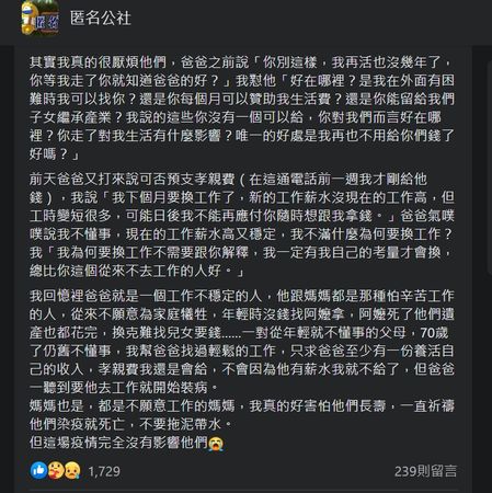 根據ETtoday報導,有網友在臉書「匿名公社」發文表示,父母認定小孩開始工作,就代表已經獨立要開始回饋給爸媽,因此打從自己14歲開始離家工作謀生後,就一直被自己的爸媽索討所謂的孝親費,甚至就連自己結婚生子身上的負擔加重後,這筆費用也從來沒有少給過,「一給就是30多個年頭」。
