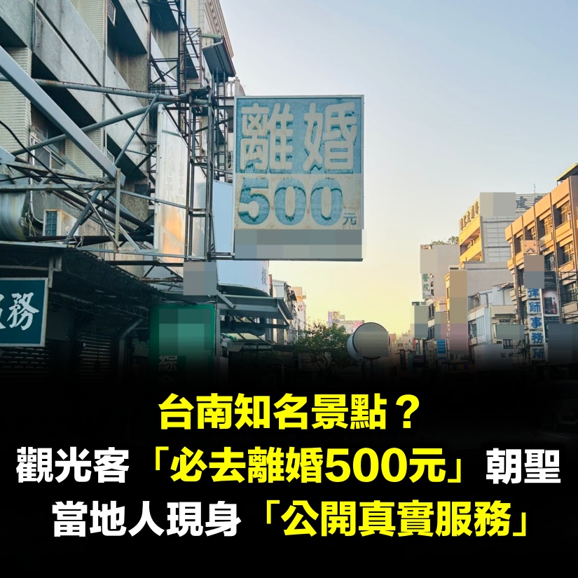 台南知名景點?觀光客「必去離婚500元」朝聖照曝光 當地人「公開真實服務」 力量人 2026-01-06 檢舉 這起「離婚招牌」爆紅事件,充分展現台灣街頭文化的獨特魅力。對台灣人來說稀鬆平常的代書店招牌,在日本遊客眼中卻成為新奇有趣的拍照景點。看來想吸引國際觀光客,有時不需要刻意包裝,最接地氣的在地風景反而最能引起共鳴。圖片來源:X不知道大家是不是都看過這個「知名地標」呢?資料來源:TEEPR亮新聞 Advertisements 回首頁 2/2 Advertisements 編輯精選推薦 More + 中國增加關稅!台灣1水果「出口雪崩下跌」重創農民 政府急了:國人快買 最新/賈靜雯深夜慟曝「她已離世」 淚PO合照喊:真的好愛你... 曾比江蕙紅!台語歌后「爆未婚生子」遭指指點點 「2次手術害癱瘓」72歲近況曝 趕在40歲前閃婚!八點檔女星「宣布嫁給他」 尪驚人身分曝「媒人是柯叔元」 晚年兒孫滿堂!73歲影壇大哥「拄拐杖現身」腳步蹣跚 兒子「全程攙扶不喊累」網羨:又帥又孝順 功德圓滿了!台語歌后「悲曝他離世」享壽95歲 淚喊:去當快樂的神仙吧... 格林童話小鎮❤️濱海城鎮裡「繽紛繪本小木屋」林立街道旁 為維護童話氛圍「霸氣禁止連鎖店進駐」 狠斷8年婚!一線小生「被爆淨身出戶」終於離婚 認了「像被雷劈到」才會娶她 晚年隱居台東!68歲名主持失蹤「車內身亡」 伴侶悲曝「死前做1事」:還掛念著我 以為只是小感冒!本土女星悲痛證實「他併發肺炎過世」 一度淚灑現場「後悔同意插管」 24歲兒失明!于美人爆「他在飯店掃廁所」維生 不盼紅包只求「別再花我的錢」 婚變尪落跑!單親媽「獨扛千萬債養孩」到處躲黑道 「一開口驚艷眾人」熬成台灣歌后 台中要加發每人5萬元?盧秀燕最新回應:「1條件」就發錢 15歲兒「睡夢中離世」!本土女星「送愛子火化」求做1事 「PO照圓滿了」:媽媽和你永不分開 85歲失智父身亡!林葉亭突宣布「皈依佛門」 遇大師「開示一番話」忍不住淚崩 22歲愛女病逝!資深男星「走不出喪女痛」留白長髮現身 掛骨灰項鍊「代女做1事」惹淚 本土劇女星生了!7年前凍卵「終於來到我身邊」 歌手尪嗨喊:生個足球隊 最新/3度中風送醫!資深男星爆離婚「斷50年髮妻」 「砸1億淨身出戶」家族爆紛爭 他真的每天都在...具俊曄「暴瘦坐墓園」天天伴亡妻 粉絲直擊「悲傷身影」淚:最深情男人 空窗多年!68歲陳美鳳突羞認「身邊有個他」 40年前就認識「遭男方母親拆散」 40萬塊全搞定!二手老屋「一下雨就漏水」根本無法住 暴風改造「北歐風質感豪宅」浴室根本網美點 弟成植物人、姊猝逝!玉女歌手「遭前夫設套」騙走娘家房產 「狠斬16年婚姻」近況曝 壽司店狂嗑1小時!2位大媽「結帳竟然是0元」黑暗手法曝光 店員傻眼:「直接走出去就好」 離婚11年!洪榮宏愛女結婚「終破冰前妻」 「2爸爸牽她進場」催淚畫面曝 台灣大咖病逝「享壽83歲」!周遊告別式痛哭「認婚內出軌」:兒子很恨我...