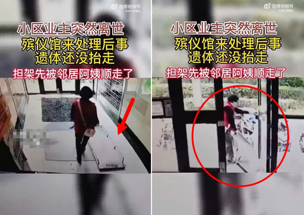畫面中顯示一名社區婦人路過大廳發現擔架,以為沒人要,竟然用一隻手就把擔架抬起,準備拿去變賣,警方也立刻逮到人,隨後用盜竊罪名將婦人帶回偵辦。